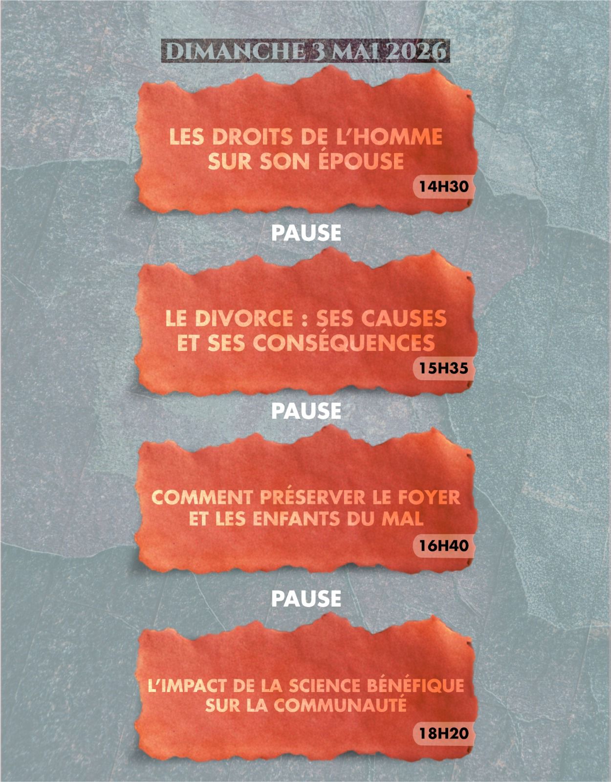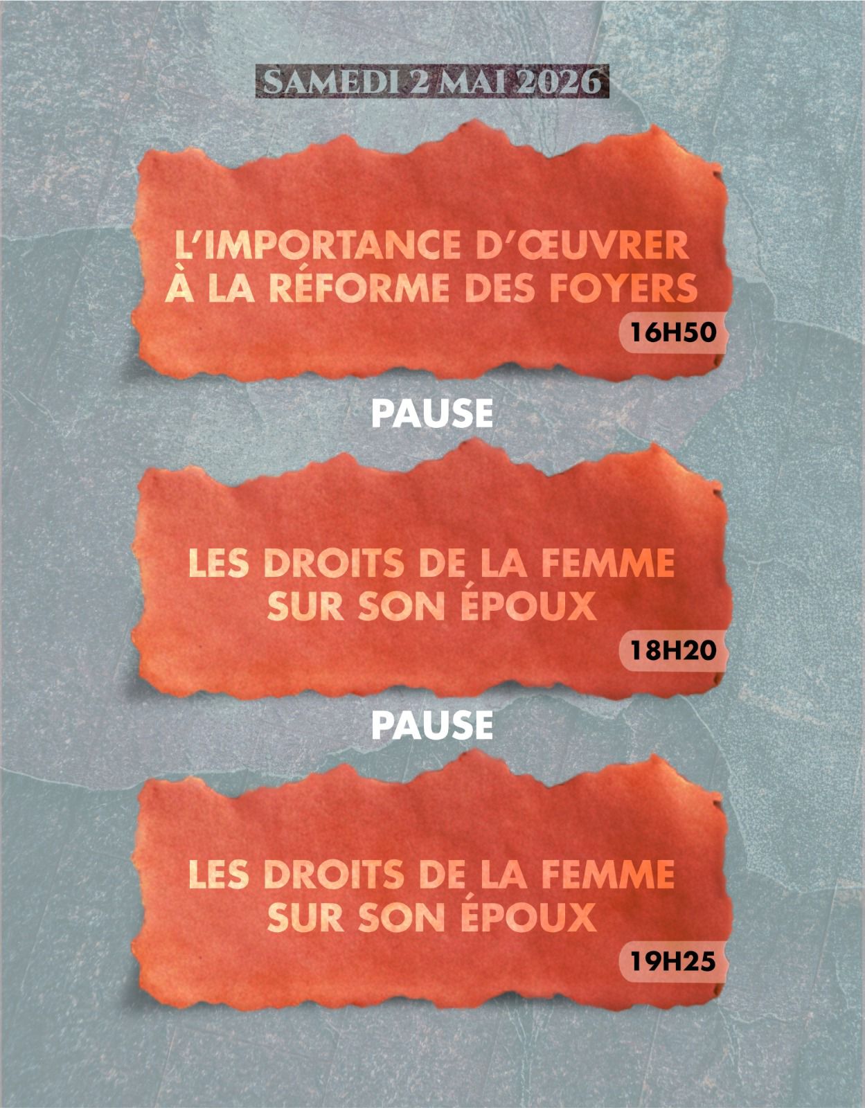 Nous avons le plaisir de vous inviter à une série d’interventions ce week-end portant sur le thème de la réforme des foyers à la lumière du Coran et de la Sounnah .